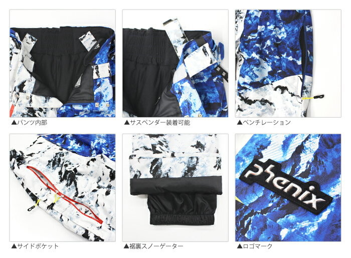 PHENIX 피닉스 스키 복 ■ Demo Team Pro Pants PF772OB11 ● 소재 <표> 스노우 마블 프린트 4-way 스트레치 태 피터 2L (폴리 에스테르 100 %) <뒷면> 브러쉬 드 트리코 (폴리 에스테르 100 %) · 하이덴 시티 타프타 (폴리 에스테르 100 % ) <안솜> 다이 제 나이트 서모 (폴리 에스테르 94 %, 아크릴 6 %) 폴리 에스테르 허벅지 : 77cm (L) · 설산을 모티브로 대리석을 표현한 역동적 인 무늬 · 비대칭 디자인 · 표에 보이지 않는 에지 가드 무늬 × 무늬 컬러 블록 디자인 (WTNV, WTRD) 옐로우 포인트 컬러 악센트 · ORCA SHELL · DRY BARRIER 20000 · DIGENITE THERMO · 4WAY STRETCH